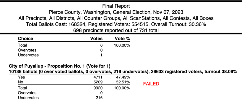 In sum, our impression was that before receiving the Puyallup Voters for Inegrity mailer and viewing our website, anti-tax voters were already going to vote no, establishment voters were going to vote yes, some progressives were going to vote no, while independents and moderates from both parties were going to vote “yes” since they didn’t know of any other solutions other than what the police chief and council members offered to the problem of our out-dated public safety facilities.