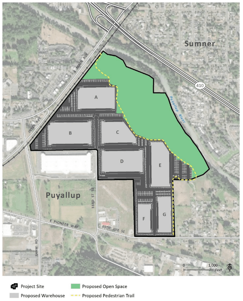 Re: That Pedestrian Trail – The updated plan is not consistent with the nature of the Riverwalk & Foothills Trail system. Who wants to walk/bike/board next to 7 giant warehouses? The buffer should include a full environmental restoration of the Puyallup River streambank with with additional vegetative buffering to eventually “hide” warehouses from the trail. All building walls should be terraced to grow vegetation (native or agricultural crops) with a goal of no empty wall space visible from any direction. All asphalt areas must be bordered by native “rain garden” runoff areas with a property easement ensuring they are maintained as such in perpetuity by property owners.