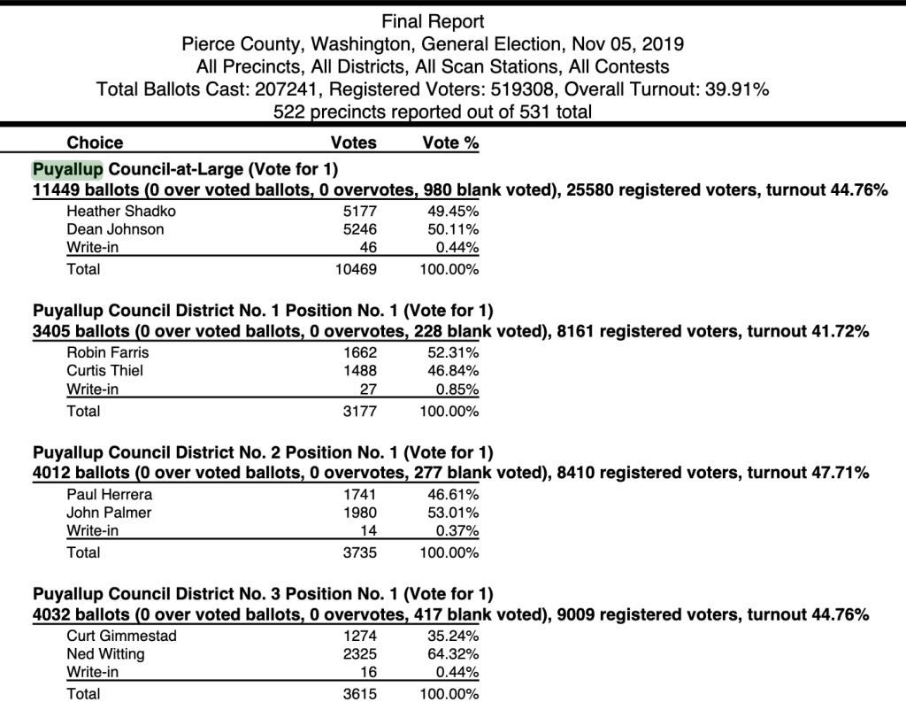 In 2021, voting turnout in Puyallup was 4% higher than countywide, and in 2017 ours was on par with the 28.5% countywide turnout. In 2019, the interest we helped generate in the warehouse fight brought Puyallup turnout up to about 44% compared to countywide turnout under 40%. Please note below in the at-large race, both candidates opposed warehouses and neither was supported by the warehouse PACs. The remaining district races were all won by candidates opposing warehouses.