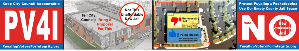 With an unnecessary jail, this is the wrong proposal, at the wrong time – too late for low interest rates, and likely to fail again which will keep our misdemeanor inmates and correctional staff in substandard conditions for even longer, unless the city finally takes the initiative to contract with our Pierce County jail (and/or Nisqually) to book our misdemeanor inmates. Our goal at Puyallup Voters for Integrity is to encourage city council to do the right thing next year.