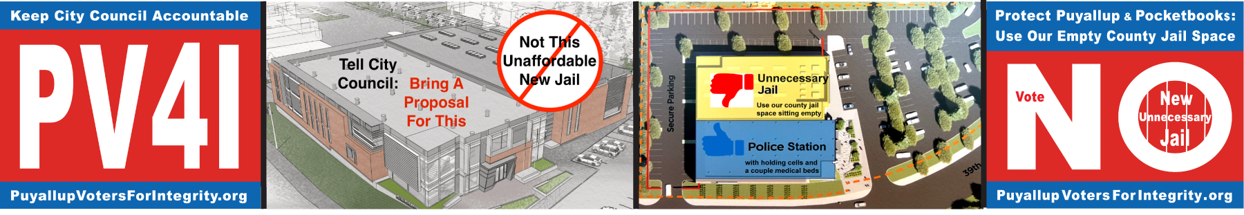 Use Our County Jail Space – 800 Beds Sitting Empty We need an affordable Public Safety Building solution that Puyallup can proudly agree on. We all agree that the city’s old Public Safety Building housing the police station and city jail is less than ideal. The question is whether the bond proposal being put to … Continue reading Vote NO Nov 7, 2023 on Unnecessary New Jail